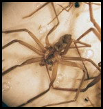 Like the black widow spider, the brown recluse spider bites in defense and does not bite humans instinctively. They will bite humans when the clothing they are hiding in is worn. The brown recluse spider bite is painful and can produce an open, ulcerating sore.
